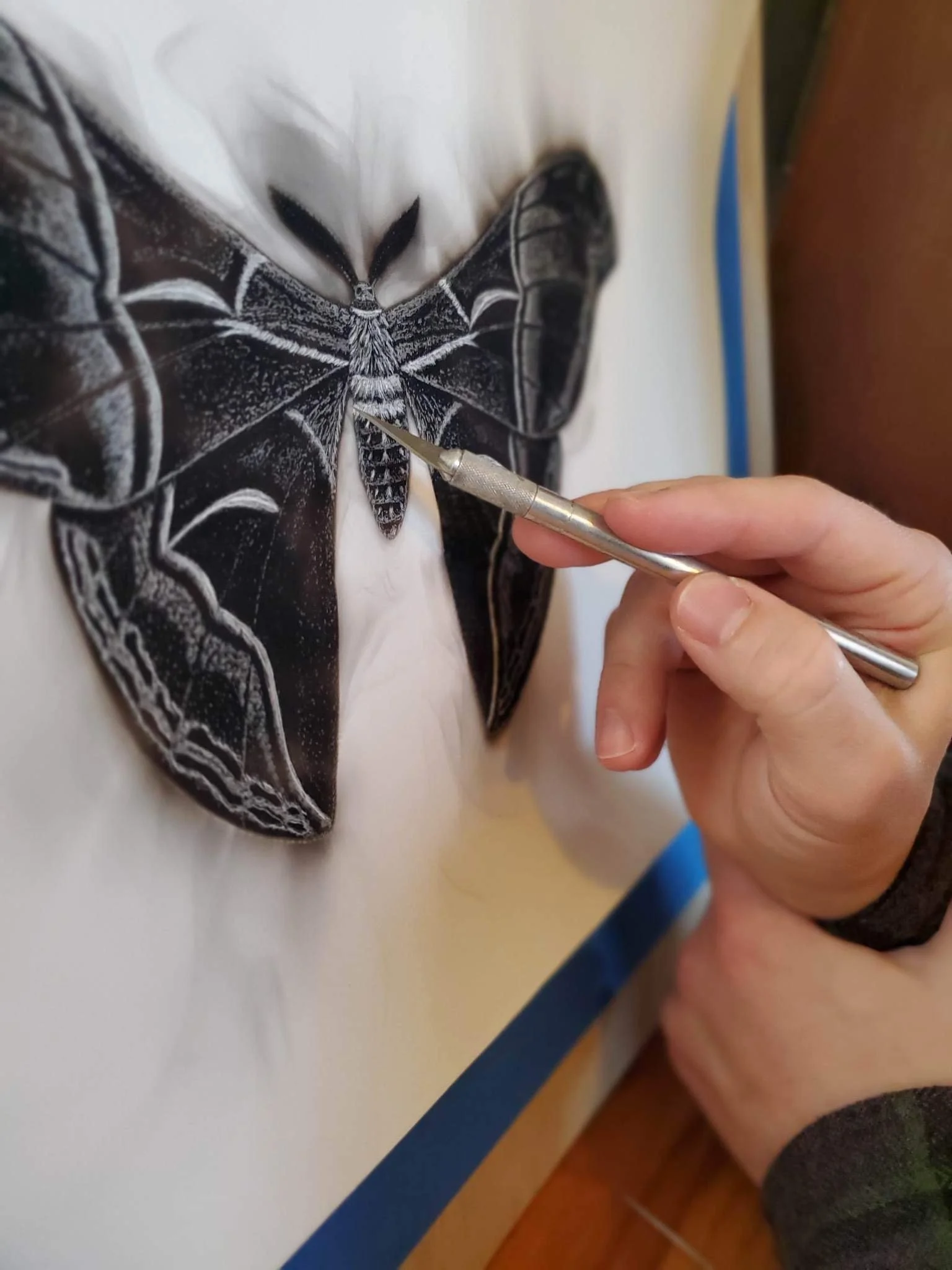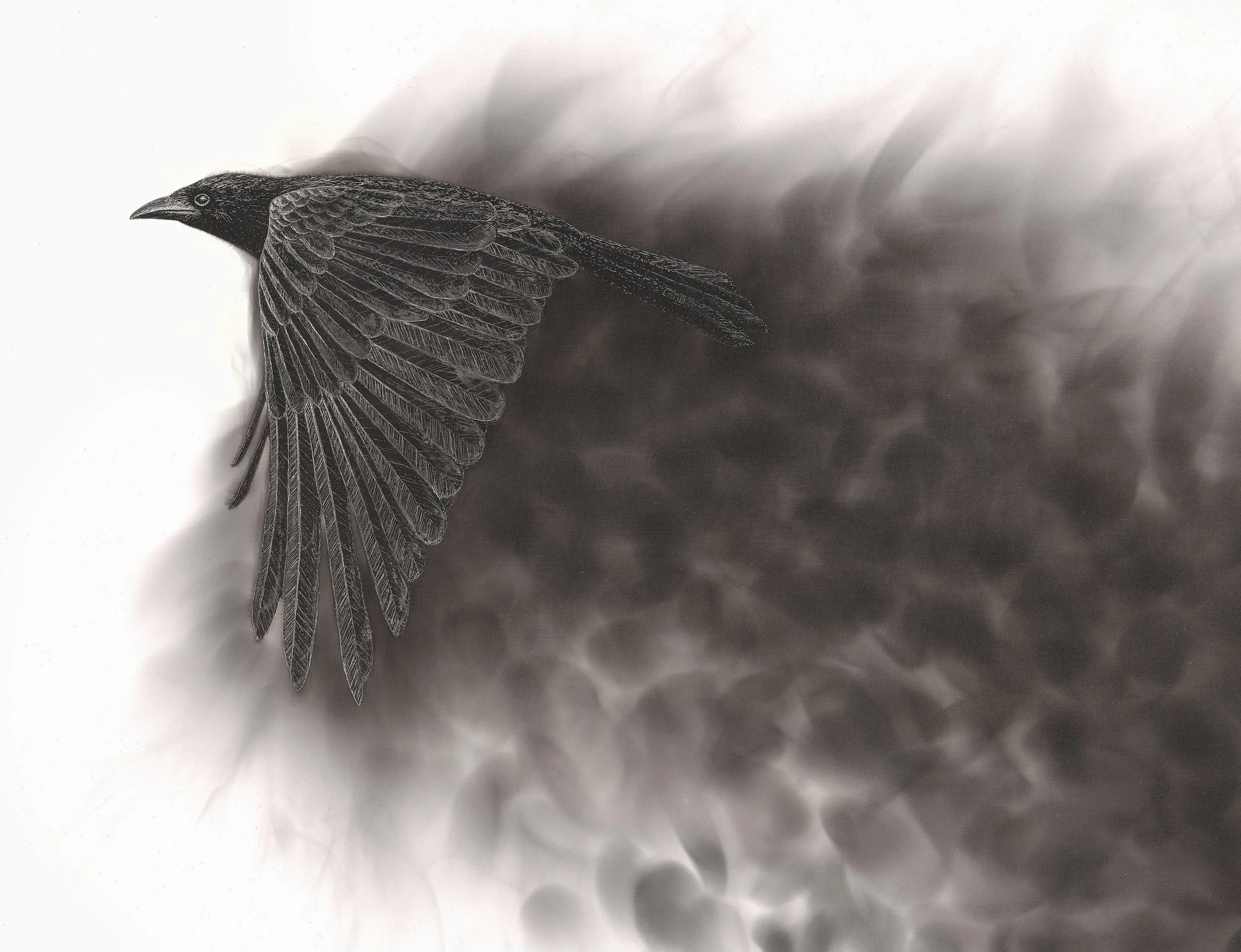 My mediums are paint, ink, and fire. My specialty is fumage, where I deposit soot from a candle onto a piece of paper or canvas, and then use a knife blade to etch into the soot to refine the image.